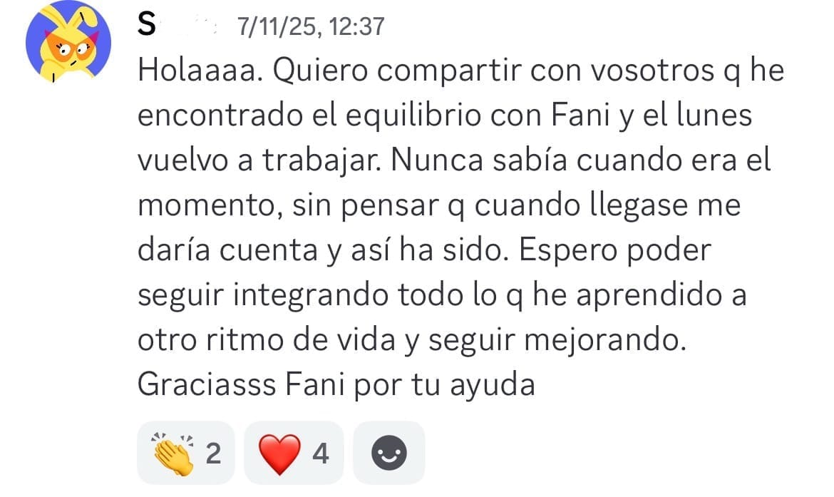 Dispondrás de soporte vía chat de lunes a viernes, además de acceso a nuestros directos privados mensuales con Fani donde podrás resolver todo aquello que necesites directamente con ella.