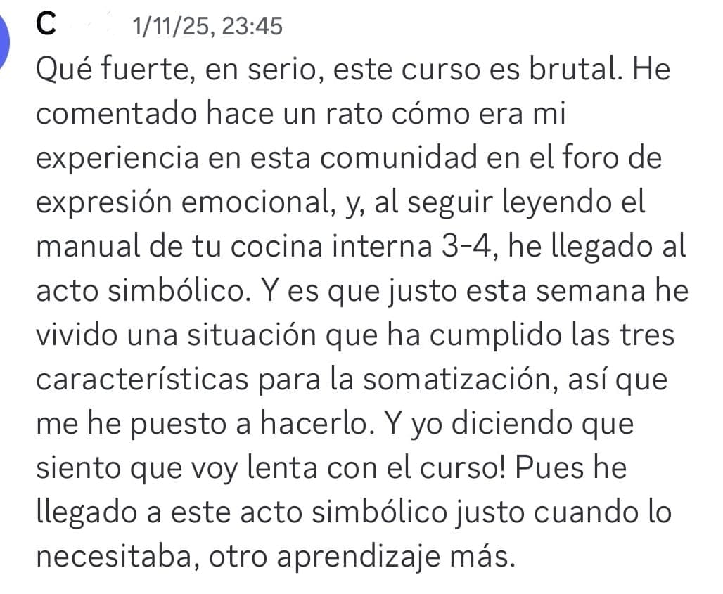 Hasta que me formé bioquímica, psiconeuroinmunóloga y terapeuta inconsciente especialista en patologías digestivas, psicosomática y TCA, gracias a ello, diseñé un método que me ayudó construir esa escalera que me sacó del pozo, y desde entonces como buena carpintera sigo acompañando a construir más escaleras para que todo el mundo tenga la oportunidad de salir de esa oscuridad.